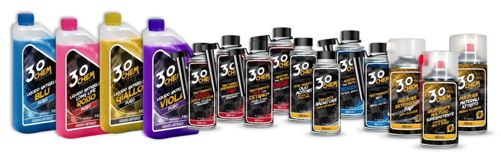 I prodotti chimici 3.0 CHEM sono caratterizzati da una qualità certificata e descrizioni per l’uso chiare e sintetiche che assicurano una soluzione rapida a vari problemi che possono verificarsi durante la vita di un autoveicolo, dall’additivo carburante al turafalle radiatori passando da un pulitore freni a uno sbloccante universale. La gamma consiste in prodotti additivi liquidi e spray.